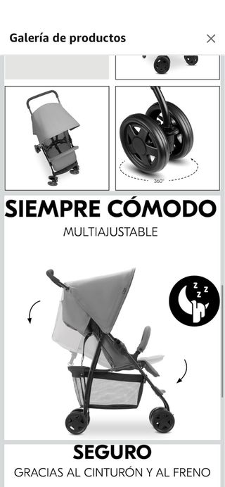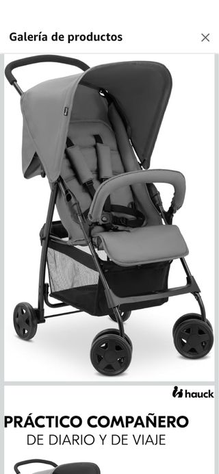 Silla de paseo Hauck en color gris, práctica para el día a día y para viajar. - Capota amplia. - Cesta de almacenamiento. - Arnés de seguridad. - Ruedas delanteras giratorias.