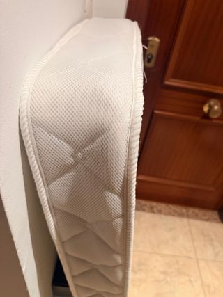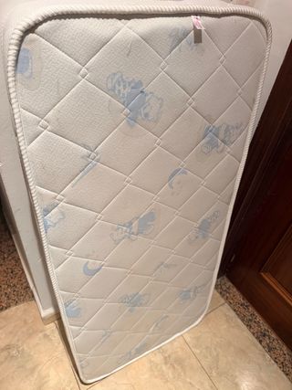 apenas usado unos meses por un solo bebé. Colchón para cuna con un diseño infantil de ositos en color azul. La funda es blanca y está acolchada con un patrón de rombos. - Diseño con ositos azules. - Tejido blanco acolchado. - Bordes reforzados.