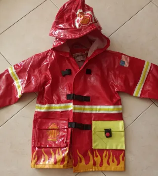 Disfraz de bombero para niños, ideal para juegos y fiestas. - Diseño inspirado en uniforme de bombero. - Capucha con insignia. - Cierres de clip. - Bolsillos decorativos. - Estampado de llamas en el bajo.