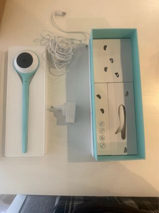 Cámara de vigilancia para bebés en color azul y blanco. Incluye todos los accesorios necesarios para su funcionamiento. - Cámara con diseño ergonómico. - Muy buena visión nocturna.