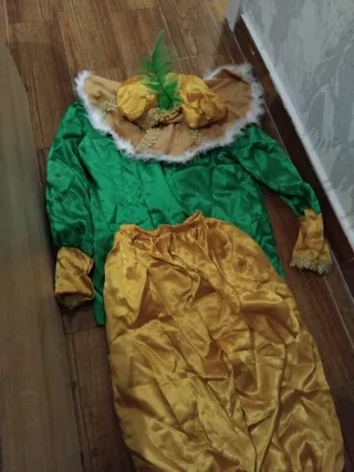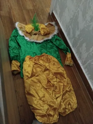 Conjunto de disfraz de carnaval con detalles festivos. - Prenda superior de color verde brillante. - Pantalón o falda de color dorado satinado. - Cuello decorado con peluche blanco y detalles dorados. - Adorno de plumas verdes en el cuello.