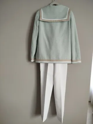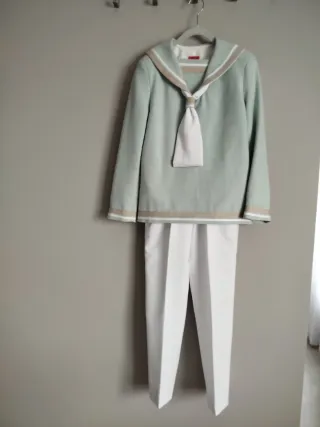 Conjunto de traje de comunión estilo marinero. - Casaca color verde agua y tostado. - Pantalón a juego en color blanco. - Cuello marinero con detalles. - Casaca y pantalón con forro interior.Pantalon con tirantes de goma ajustable con botón,para que el pantalón no se mueva y quede siempre en su sitio.Talla 9 ambas prendas. Actualmente en catálogo de Club Cadete Comuniones 2026.