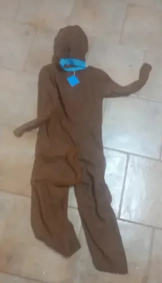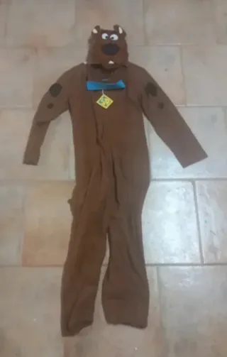 Disfraz de Scooby Doo para niños. - Talla 3/4. - Diseño de perro marrón con capucha. - Incluye mono y capucha con cara del personaje y collar azul y placa. - Ideal para fiestas de disfraces.