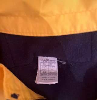 Chaqueta impermeable de color amarillo de la marca Oxlane. - Talla: 10 años (134/145 cm). - Fabricada en China.