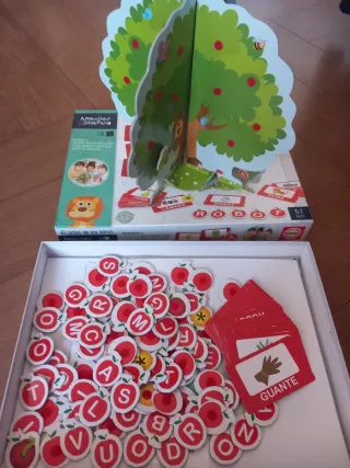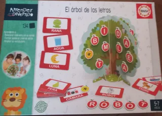 Juego educativo El árbol de las letras de Educa. - Fomenta el aprendizaje de letras y vocabulario. - Incluye árbol, letras y tarjetas con imágenes y palabras. - Diseñado para niños de 5 a 7 años. - Materiales reciclables.