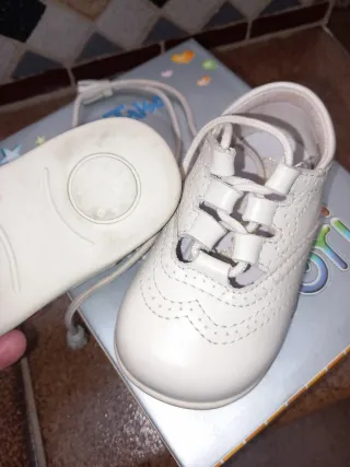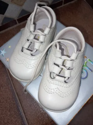 Preciosos zapatos de bebé en color crudo, perfectos para ocasiones especiales o el día a día. Talla 18 - Diseño clásico con cordones. - Detalles troquelados decorativos. - Suela flexible.