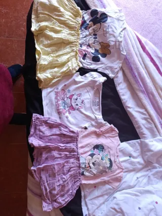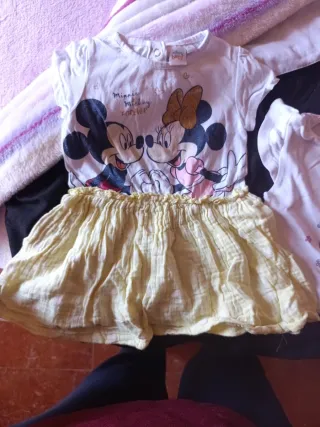 Conjunto de ropa para bebé con personajes de Disney. - Vestido banco morado con Mickey y Minnie. talla 80cm - Camiseta blanca con Marie de los Aristogatos. Talla 74 cm - Vestido rosa con Minnie. Talla 80cm Pack de 3 prendas 5€
