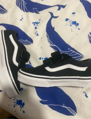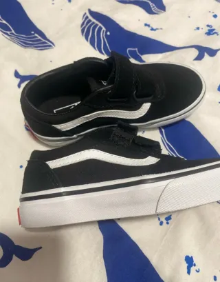 Zapatillas Vans negras originales. - Cierre de velcro. - Diseño clásico con banda lateral blanca.
