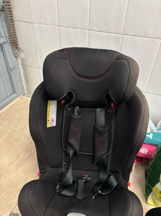 Silla de coche para bebé en color negro con detalles en rojo. - Sistema de arnés de 5 puntos. - Funda extraíble y lavable. - Indicador de instalación correcta.