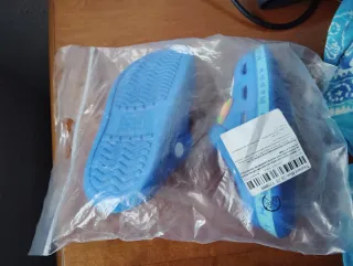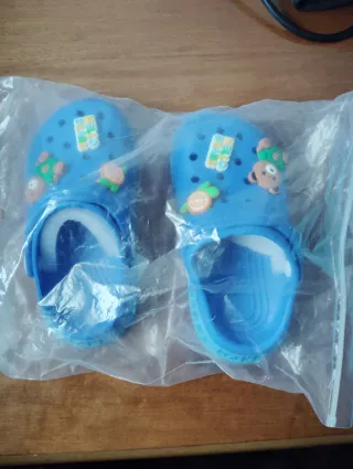 Chanclas infantiles de color azul, perfectas para los más pequeños. Presentan divertidos adornos. Talla 28-29. - Adornos de animales y frutas. - Diseño tipo zueco.