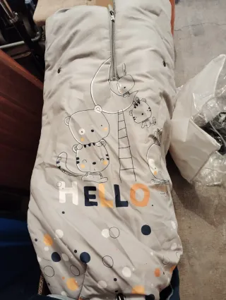 Saco de invierno para carrito de bebé con un adorable diseño. Marca HELLO KITTY. - Color gris claro. - Estampado de animales y con círculos. - Cremallera central. - Acolchado para mayor comodidad.