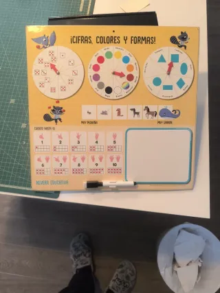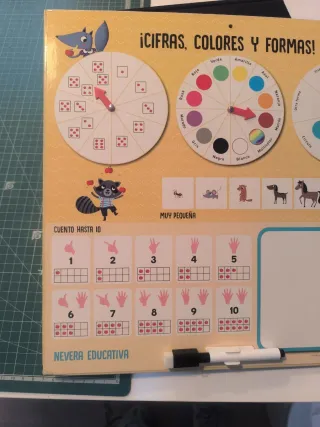 Pizarra educativa para nevera con actividades de cifras, colores y formas. - Incluye ruedas giratorias para números, colores y formas. - Secciones para contar hasta 10 con manos y puntos. - Pizarra blanca integrada para escribir y dibujar. - Marcador incluido.