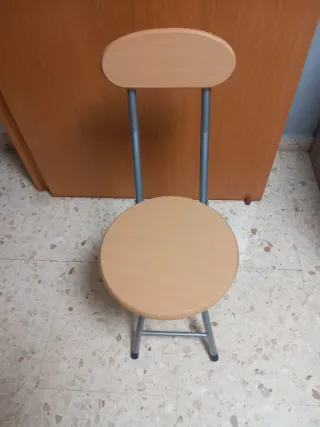 Práctica mini silla plegable, ideal para llevar de viaje o usar en espacios reducidos. Su diseño compacto la hace muy manejable. - Asiento y respaldo de madera clara. - Patas y estructura metálicas.