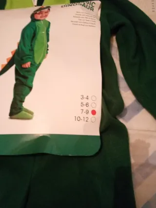 Disfraz de dinosaurio para niño, usado una sola vez. Ideal para fiestas o carnaval. Es de uno de los personales de Estoril Estori - Color verde con detalles naranjas. - Incluye mono con capucha. - Talla 7-9 años.