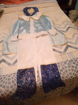 Disfraz de príncipe para niño, usado solo una vez. O de Aladino. - Parte superior azul satinada con detalles dorados. - Pantalones blancos. - Cubrebotas azules con estrellas doradas.y cinturon