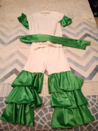 Conjunto de disfraz de carnaval con detalles en verde brillante. - Parte superior blanca con mangas abullonadas verdes. - Pantalón blanco con volantes verdes en cascada. - Cinturón verde a juego.