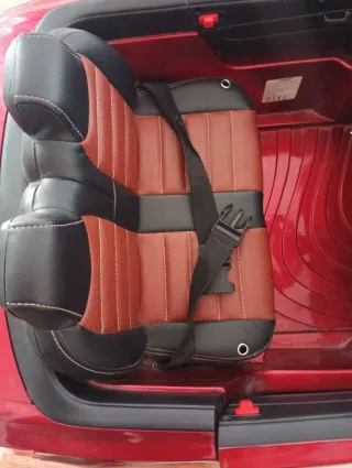 Coche eléctrico para niños con asiento de cuero sintético y cinturón de seguridad. - Diseño deportivo en color rojo y negro. - Asiento acolchado con costuras decorativas. - Cinturón de seguridad de 3 puntos. - Precio negociable mejor ver y probar lo vendo por no darle uso
