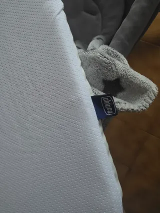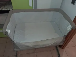 Minicuna de colecho de la marca Chicco en color gris. Se encuentra en muy buen estado. Es ajustable en altura, tiene las patas plegables y se puede inclinar. Incluye el colchón y tiene correas para fijación a la cama. También tiene mosquitera y viene en una bolsa de tela. - Diseño moderno y funcional. - Laterales de malla transpirable.