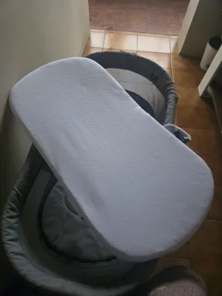 Minicuna de colecho de la marca Chicco color gris. Se puede amarrar a la cama aunque no tengo las correas (las venden sueltas universales). Opción balanceo o fija 10 posiciones de altura, admite inclinación mas alta en cabeza Muy buen estado Incluye colchón y una bajera.