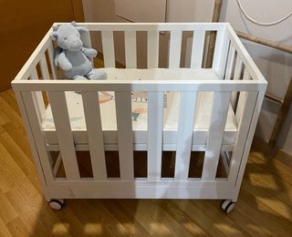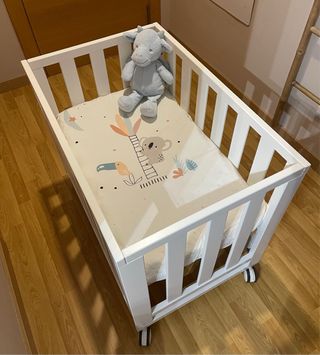 Preciosa minicuna colecho en color blanco, perfecta para los más pequeños. Se encuentra en muy buen estado y es muy práctica gracias a sus ruedas. Hasta los 12 meses la puedes usar sin necesidad de tener una cuna más grande, la tuve tanto en la habitación como en el salón, al poder moverla es muy práctica. - Estructura de madera blanca. - Cuatro ruedas para facilitar el movimiento COLCHÓN MINICUNA; - Tejido transpirable. - Diseño acolchado. - Antiplagiocefalia - Topper extraible - Hipoalegenico - Transpirable - Previene la asfixia ( cuna y colchón serían 150€ ). ( La cuna sin el colchón serían 95€ ) PRECIO NO NEGOCIABLE.
