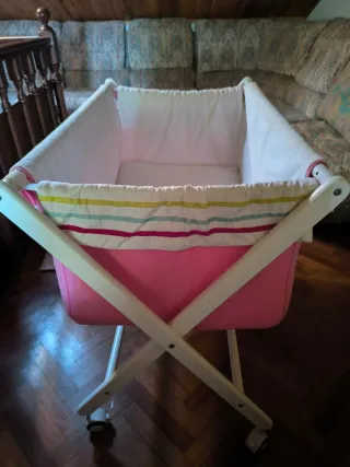 Mini cuna colecho en muy buen estado, estructura de madera natural, muy estable y resistente. Incluye: Colchón Protectores laterales acolchados Textil interior completo Ruedas con freno para fácil movilidad Diseño plegable tipo tijera (ocupa poco espacio) Ideal para recién nacido, perfecta como cuna auxiliar, colecho o para tener al bebé cerca por la noche. Muy cuidada, siempre en ambiente sin humo ni mascotas. Color beige neutro, combina con cualquier habitación infantil. Lista para usar. 📍 Recogida en mano en Pontevedra centro. 💬 Cualquier duda, escríbeme sin compromiso.