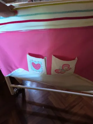 Minicuna en perfecto estado, casi nueva, con un bonito estampado de estrellas en rosa. - Estructura blanca plegable. - Ruedas para facilitar el movimiento. - Incluye colchón y vestidura.