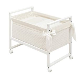 Minicuna de colecho en color blanco, ideal para tener al bebé cerca durante la noche. Su diseño permite acoplarla a la cama. - Estructura de madera. - Ruedas para facilitar su movilidad. - Laterales de barrotes.