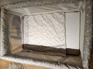 Minicuna plegable para bebé con un diseño moderno y práctico. Perfecta para moverla por casa. - Estructura de madera blanca. Hay algún peladito en la parte baja de las patas. - Ruedas con freno. - Tejido con estampado de estrellas en blanco y gris. - Incluye colchón y almohada y cubre. NOTA: Si se desea, disponible colchón de Nou futur de 50x75 con funda de colchón invierno/verano en muy buen estado por 20 euros.