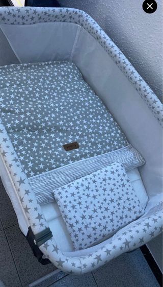 Minicuna de la marca Jane, ideal para los primeros meses del bebé. Su diseño permite colocarla junto a la cama.Esta en perfecto estado y se hace colecho - Estructura metálica. - Laterales de malla transpirable. - Borde superior con estampado de estrellas.