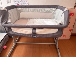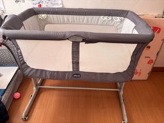 Minicuna de colecho de la marca Chicco, modelo Next2Me. Su diseño permite colocarla junto a la cama para mayor comodidad. - Color gris. - Estructura metálica. - Colchón incluido. También incluimos ropa de cama de la cuna.