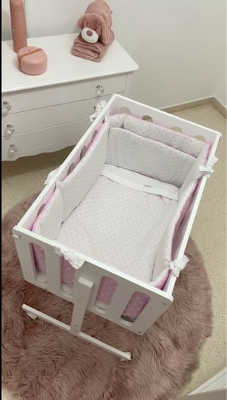 Minicuna de colecho con estructura de madera en color blanco. Ideal para tener al bebé cerca. - Ruedas para facilitar el movimiento con frenos. - Interior con textiles de estrellas rosas y blancas. - Incluye todo lo que se ve en fotos. - Medidas - Tiene hasta 4 diferentes alturas de tamaño interior. - Mide 80cm x 50cm. Palabras claves: Cuna, cama, bebé, niño, niña, dormitorio.