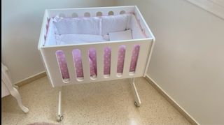 Minicuna en buen estado, ideal para los primeros meses del bebé. Su diseño es dulce y funcional. - Estructura de madera blanca. - Textil en color rosa y blanco. - Ruedas para facilitar el movimiento.