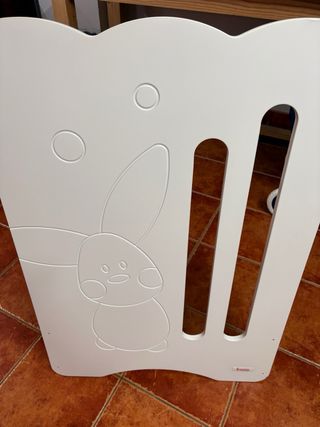 Minicuna para bebes de 0a 24 meses. Blanca de madera y tejido lino acolchado blanco limpio en tintorería. Tiene ruedas con freno. Se puede desmontar. Incluye funda de almohada y colcha nórdica del mismo tejido. Se vende con base de madera, colchón de espuma, colchón impermeable y empapador maeca prenatal. El borde de los lados de la cuna está a 70 cm del suelo.