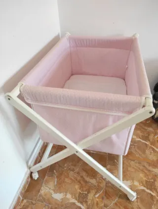 Minicuna tipo tijera, tela rosa de rallas y patas color madera. Tiene ruedas para facilitar el movimiento. Viene sin colchón (medidas 70x50). Recogida Son Caliu (Palmanova)
