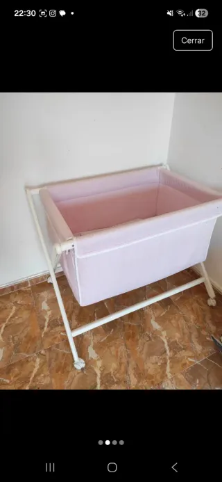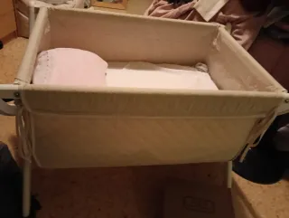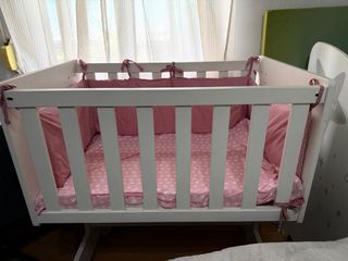 Minicuna de colecho para bebé, en perfecto estado. Se ha usado muy poco, solo dos meses. - Color rosa y gris. - Laterales de malla transpirable. - Colchón blanco con relieve. Uso de 2 meses Pague 120€ por ella, me voy de mudanza y no puedo llevarla conmigo las manchas que se ve es agua, la acababa de limpiar, puedo enviar mas fotos y videos