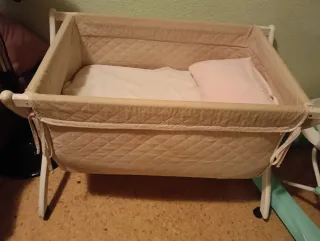 Minicuna de madera con un diseño moderno y funcional. Perfecta para tener al bebé cerca. - Estructura de madera. - Incluye ruedas para facilitar su movilidad. - Tejido exterior en color azul claro. - Colchón incluido. - sábana protectora y bajera incluida - funda en color rosa incluida - Tiene algún desconectado en la madera del uso pero con volver a pintar es suficiente. - Las ruedas funcionan bien y tienen frenos adaptable para fijar la minicuna Se pueden enviar mas fotos por privado