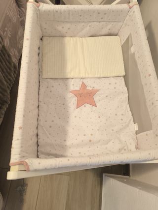 Minicuna en perfecto estado, casi nueva, con un bonito estampado de estrellas en rosa. - Estructura blanca plegable. - Ruedas para facilitar el movimiento. - Incluye colchón y vestidura.