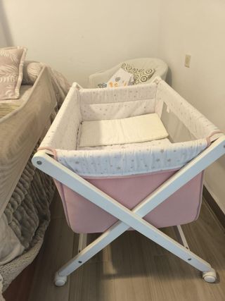 Minicuna de colecho en color rosa, ideal para tener al bebé cerca durante la noche. Se encuentra en muy buen estado. - Laterales de malla transpirable. - Incluye cesta inferior para almacenamiento. - Estructura plegable para facilitar su transporte y guardado.