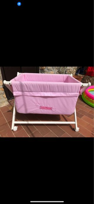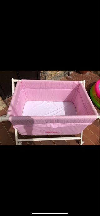 Minicuna de colecho de la marca Asalvo en color rosa. - Diseño con nubes y texto sleep. - Laterales de malla transpirable. - Estructura metálica con ruedas. -Varias alturas Prácticamente está sin usar , no tiene ninguna imperfección.