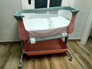 Preciosa minicuna de colecho en tonos rosa y gris. Está en muy buen estado y es perfecta para los primeros meses del bebé. - Incluye una práctica cesta inferior para guardar pañales u otros artículos. - Estructura robusta y estable. - Tejidos suaves y agradables al tacto.