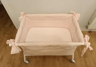 Preciosa minicuna con vestiduras a juego. Ideal para los primeros meses de tu bebé. - Incluye minicuna, colchón y nórdico a juego con las vestiduras. - El conjunto está en perfecto estado. - Diseño floral en tonos rosas y beige con lazos crepe color rosa.