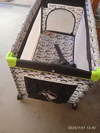 Preciosa minicuna perfecta para los más pequeños. Está en muy buen estado y lista para usar. - Diseño con estampado de estrellas grises y azules. - Incluye bolsa lateral para guardar pañales u otros objetos. - Fácil de montar y desmontar.