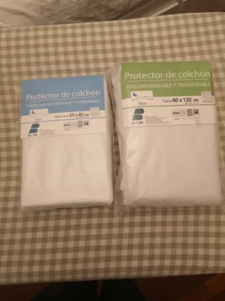 Dos protectores de colchón para cuna y minicuna, ambos impermeables y transpirables. - Protector para minicuna: 55 x 85 cm, punto liso. - Protector para cuna: 60 x 120 cm, rizo.