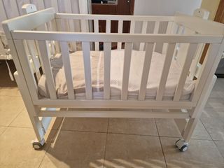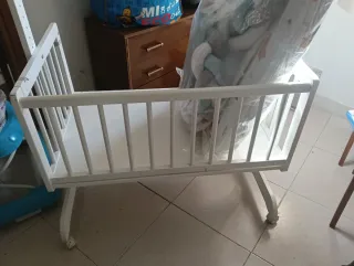 Vendo esta minicuna de madera, de color blanco, con ruedas (puedes moverla o dejarla fija) y con dosel. El colchón mide 75cm*50cm, la cuna puede balancearse o quedarse fija y está en perfecto estado. La estructura de la minicuna mide 55cm (ancho) *95cm (largo) *90cm (alto).