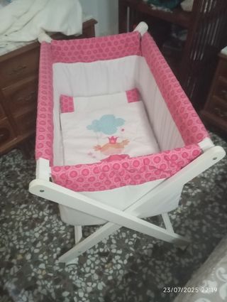 Se vende mini cuna / moisés. Incluye bastidor de madera con ruedas, cesta y revestimiento de tela azul, con colchoncito y almohada. Medida 85 de largo y 55 de ancho. Se entrega en mano en Albacete o Alicante capital.