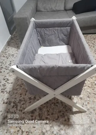 Minicuna de madera blanca en perfecto estado. Ideal para los primeros meses del bebé. - Estructura de madera. - Tejidos delicados con estampado de flores grises. - Incluye colchón impermeable, vestiduras y edredón a juego. - Ruedas para facilitar el movimiento con freno. En perfecto estado salvo por dos picaos (observar fotos). Usada muy poco. Regalo juegos de sábanas para la misma. Medidas: 82,5 cm largo 56 cm ancho 67,5 cm alto Colchón 74x50 cm