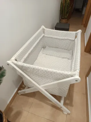Preciosa minicuna de madera blanca para bebé. Está en muy buen estado y es perfecta para los primeros meses. - Estructura de madera resistente. - Tejido estampado con motivos infantiles. - Incluye colchón. - Ruedas para facilitar el movimiento. Una pequeña mancha que se ve en la cuarta foto