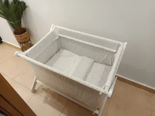 Minicuna para bebé con ruedas, ideal para los primeros meses. Está en muy buen estado y es perfecta para tener al bebé cerca. - Estructura de madera. - Tejidos blancos. - Fácil de montar y desmontar. NO Incluye colchón antiplagiocefalia marca lémur que se vende por 60€.