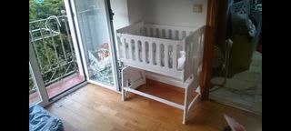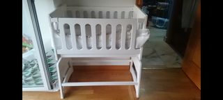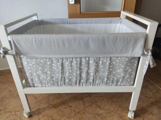 Minicuna de colecho, uno de sus laterales se abate completamente para poder unir la cama con la cuna. También se puede utilizar cerrada como una cuna normal. Es convertible en cajonera, mesa, y banco. Montaje muy sencillo. Incluye el colchón a medida,con sistema antiahogo. Incluye también las vestiduras: edredón y chichonera, como nuevos. En muy buen estado. Solo algún rasguño por el uso.