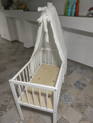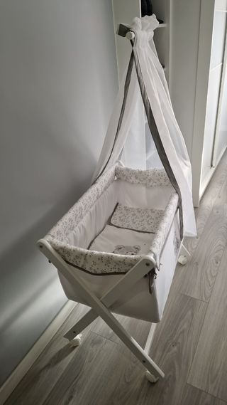 Minicuna de madera de haya con colchón, edredón, almohada y mosquitera. Solo ha tenido dos usos pues hice colecho.